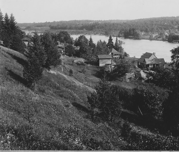 White water rapids and waterfalls once raced in the channel between Phillips Island and the west shore. These helped to power the important Gilmour's Mills, which operated on the present site of the Hydro Dam Power House (red brick structure) and on Gilmour's Island. The mills had 2 buildings situated high above the falls which provided 500 horse power. The 13 saw gates, containing about 220 saws, manufactured about 35 million of feet of lumber per season! From here, a flume ran two and a half miles to the piling grounds at Ironside and, there, on the bank of the Gatineau, were docks where the barges could load the air-dried lumber. The company owned 9 farms with 1500 acres to produce enough food for its employees and logging shanties!