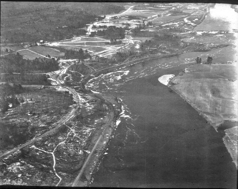 In the THEN image, Eaton Chute, a substantial waterfall, is just visible near the top right corner of the image. In the lower left corner of the THEN image, several Tenaga cottages are visible. To the right, across the river is a white sandbar or mud bank.