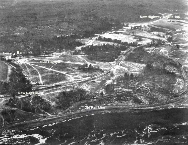 In the THEN image, at the intersection of Gleneagle Road and Highway 11 (now Route 105) a barn and farmhouse are on the left. The old rail line runs beside the swiftly flowing river. Inland, the new railway right of way is visible. Farther inland is the newly constructed road Highway 11 (now Rte. 105). In the NOW view the barn is gone, but the farmhouse remains.