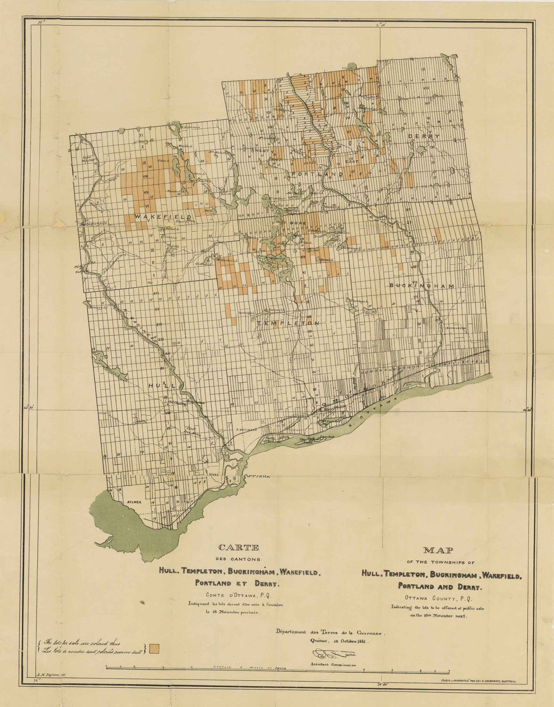 Quebec, Department of Crown Lands, "Map of the townships of Hull, Templeton, Buckingham, Wakefield, Portland and Derry, Ottawa county, P.Q., indicating the lots to be offered at public sale on the 16th November next.", 1881.